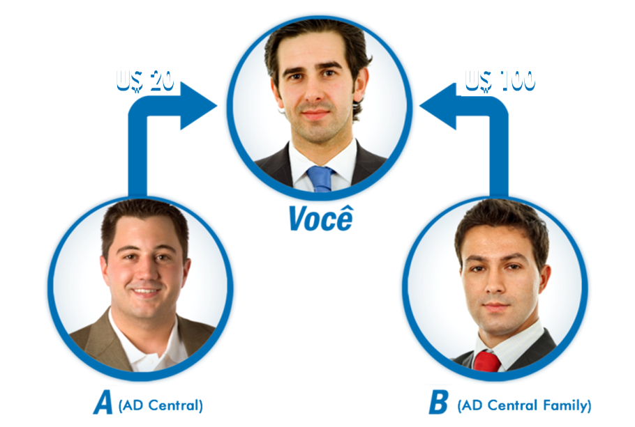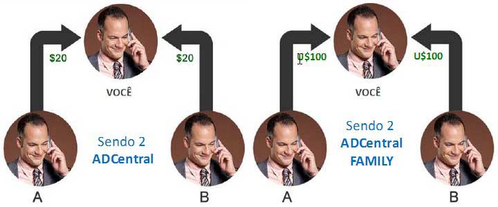 Se o seu indicado da esquerda aderiu uma ADCentral, você ganha de bônus $20, e se o outro indicado, à direita aderiu uma ADCentral Family, você ganha de bônus $ 100. Sempre que for indicação ADcentral o bônus é $20, sempre que a indicação for ADCentral Family o bônus é $100. Se os dois indicados aderirem uma ADCentral cada, você terá $ 20 de bônus de cada, se aderirem cada um uma ADCentral Family você terá $100 de bônus cada. Atenção antes de registrar seu indicado terá que ativar seu Voip, para receber os bônus, se não se lembrar de ativá-lo antes dos registros, perde o bônus.