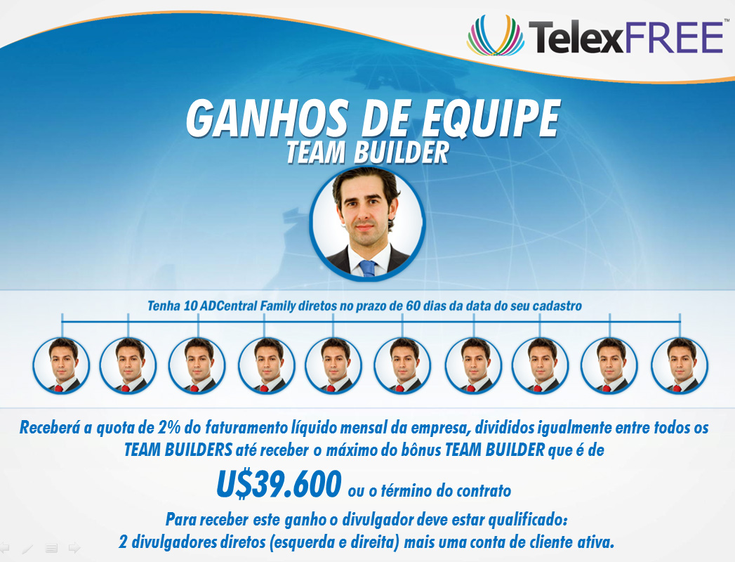 O Team Builder e todas as AD Central Family vinculadas à ele passam a publicar 1 anúncio por dia e ganham 100 dólares por semana. Depois de 30 dias como Team Builder, no mês seguinte você começa a ganhar 1% de participação sobre o faturamento da Telexfree até completar o valor do bônus que é de $ 39.600 dólares. Resumindo o Team Builder é um AD Central Family que só precisa publicar 1 anúncio por dia para ganhar o mesmo valor que as outras AD Central Family.